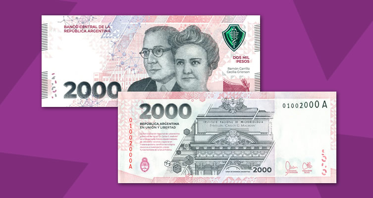 El nuevo billete fue diseñado en homenaje a la Salud Pública, al desarrollo de la ciencia y de la medicina en nuestro país. El anverso del billete del nuevo billete, muestra a la Dra. Cecilia Grierson y al Dr. Ramón Carrillo y el reverso refleja la imagen del Instituto Nacional de Microbiología Dr. Carlos G. Malbrán.