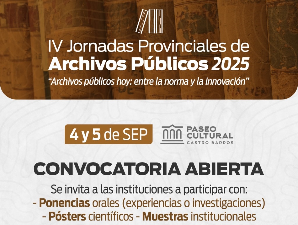 Leer más: CONVOCAN A PARTICIPAR DE LAS IV JORNADAS PROVINCIALES DE ARCHIVOS PÚBLICOS 2025El Gobierno de La Rioja, a través de la Dirección de Archivo, Digesto y Registro Oficial de la provincia de La Rioja, dependiente de la Secretaría General de la Gobernación, invita a participar de las IV Jornadas Provinciales de Archivos Públicos, que se desarrollarán los días 4 y 5 de septiembre en el Paseo Cultural Pedro Ignacio de Castro Barros. La recepción de propuestas es hasta el 15 de Agosto próximo.