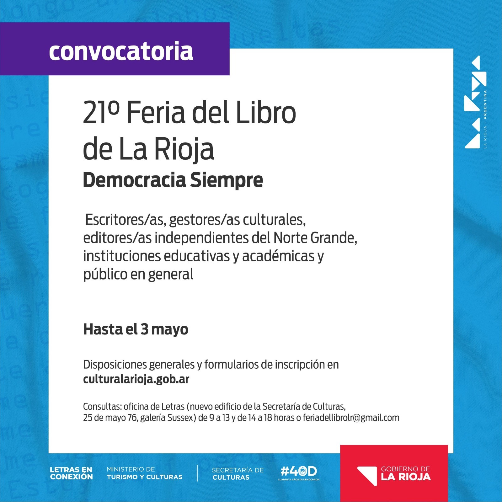 El Gobierno de La Rioja, a través de la Secretaría de Culturas dependiente del Ministerio de Turismo y Culturas, convoca a participar de la 21º Feria del Libro La Rioja «Democracia Siempre», a realizarse de manera presencial y descentralizada desde el 5 al 15 de julio.