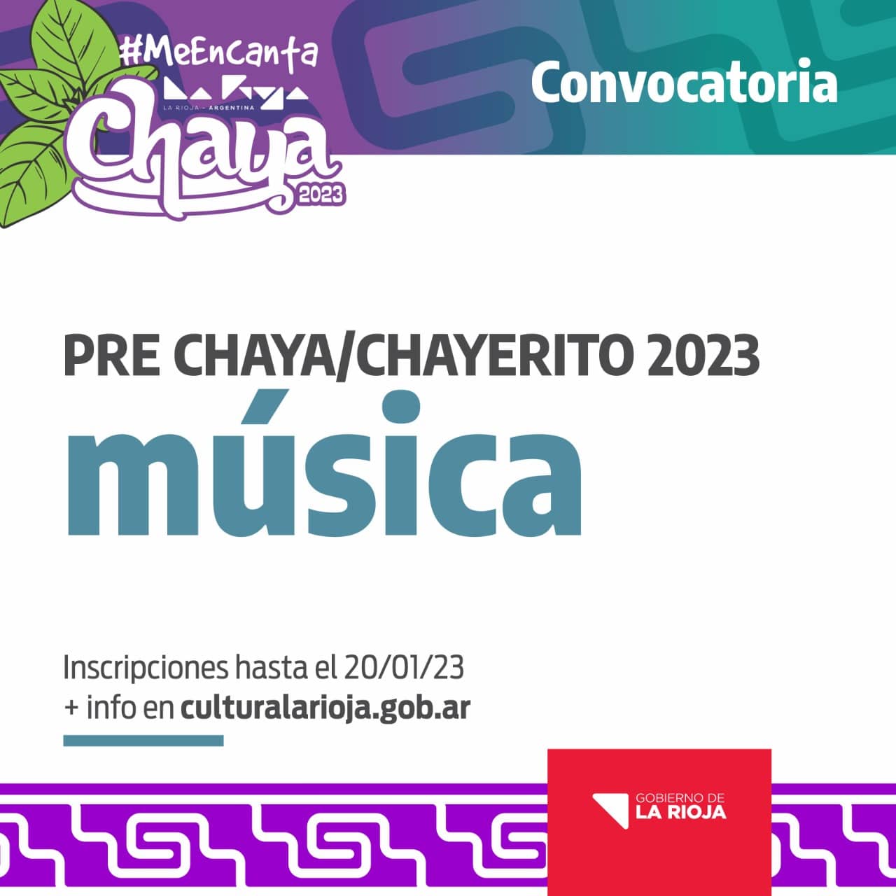 Leer más: CONVOCATORIA PARA PARTICIPAR DE LA PRE CHAYA Y CHAYERITO 2023El Gobierno de La Rioja, a través de la Secretaría de Culturas dependiente del Ministerio de Turismo y Culturas, invita a participar de las convocatorias de “La Rioja Chaya 2023”.