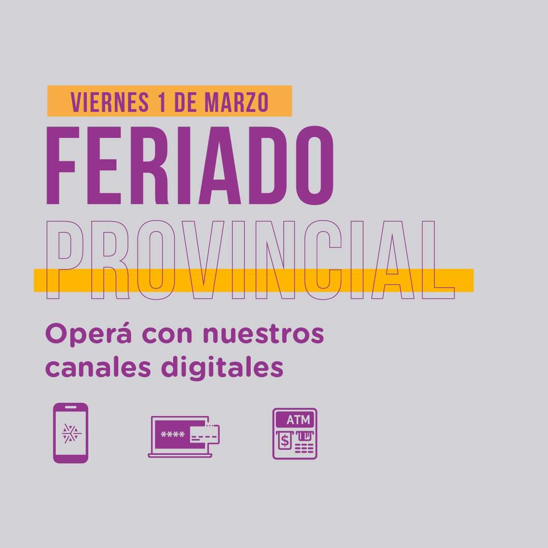 Leer más: ESTE VIERNES NO HABRÁ ATENCIÓN BANCARIA POR EL FERIADOTanto el Banco Rioja como los bancos nacionales adherirán al feriado provincial con lo cual no prestarán atención al público. No obstante, se podrá operar a través de los canales digitales (homebanking, APP y cajeros automáticos).