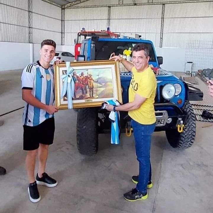 Leer más: LA RIOJA ENVIÓ OBSEQUIOS AL CAMPEÓN DEL MUNDO, JULIÁN ÁLVAREZEl gobernador Ricardo Quintela, por intermedio del Ministro de Infraestructura Marcelo del Moral, envió obsequios típicos de La Rioja a la localidad de Calchín, pueblo natal de Julián Álvarez para ser entregados al 9 de la selección nacional, como un homenaje de parte de todos los riojanos.